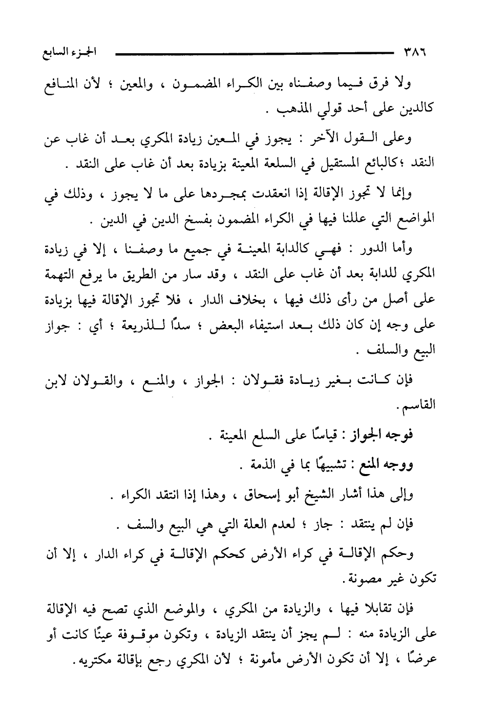 وعلى القول الآخر: يجوز في المعين زيادة المكري بعد أن غاب عن النقد؛ كالبائع المستقيل في السلعة المعينة بزيادة بعد أن غاب على النقد.