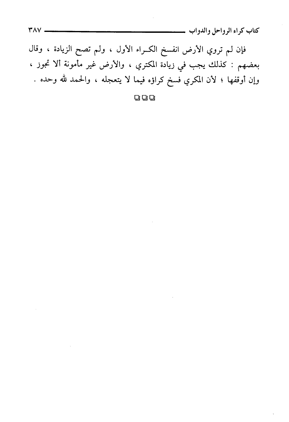 فإن لم تروي الأرض انفسخ الكراء الأول، ولم تصح الزيادة، وقال بعضهم: كذلك يجب في زيادة المكتري، والأرض غير مأمونة ألا تجوز، وإن أوقفها؛ لأن المكري فسخ كراؤه فيما لا يتعجله، والحمد لله وحده.