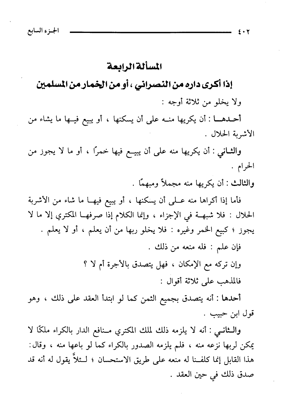 المسألة الرابعة إذا أكرى داره من النصراني، أو من الخمار من المسلمين