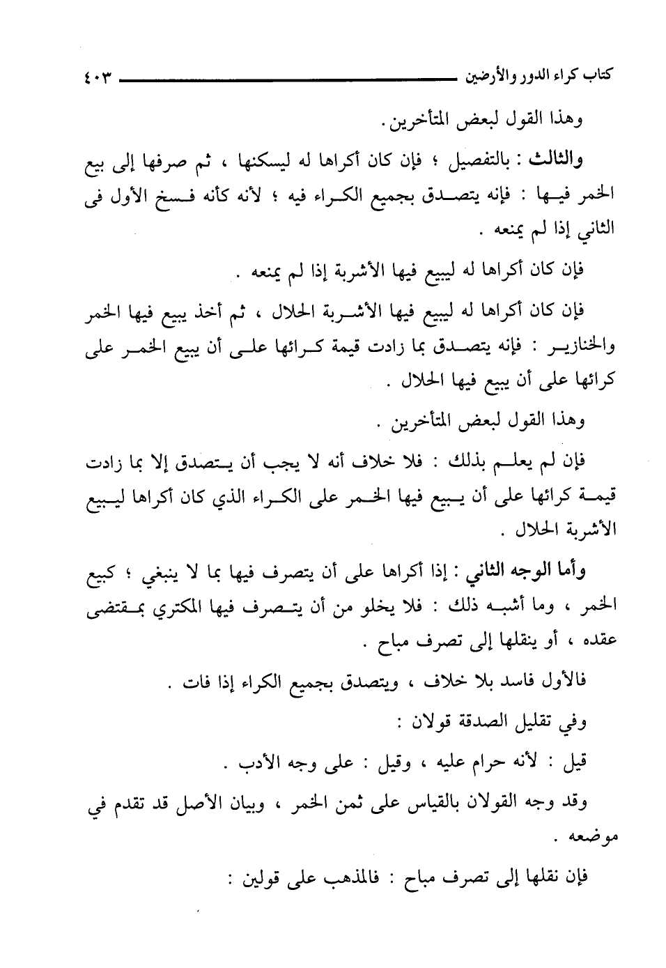 والثالث: بالتفصيل؛ فإن كان أكراها له ليسكنها، ثم صرفها إلى بيع الخمر فيها: فإنه يتصدق بجميع الكراء فيه؛ لأنه كأنه فسخ الأول في الثاني إذا لم يمنعه.