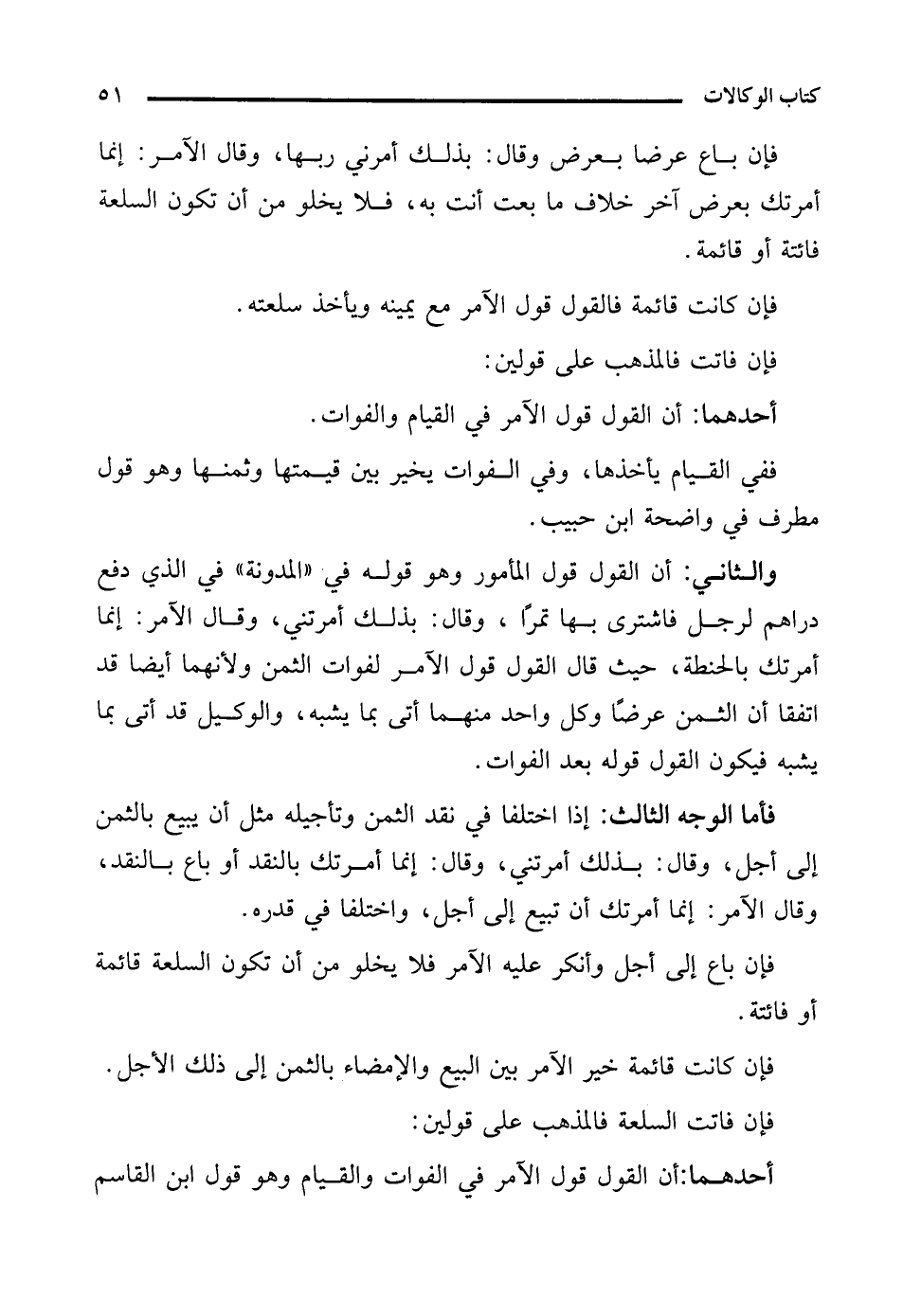 والثاني: أن القول قول المأمور وهو قوله في "المدونة" في الذي دفع دراهم لرجل فاشترى بها تمرًا، وقال: بذلك أمرتني، وقال الآمر: إنما أمرتك بالحنطة، حيث قال القول قول الآمر لفوات الثمن ولأنهما أيضًا قد اتفقا أن الثمن عرضًا وكل واحد منهما أتى بما يشبه، والوكيل قد أتى بما يشبه فيكون القول قوله بعد الفوات.