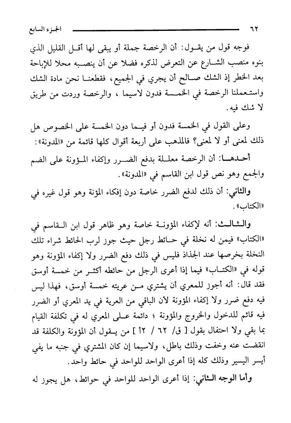 فوجه قول من يقول: أن الرخصة جملة أو يبقى لها أقل القليل الذي بنوه منصب الشارع عن التعرض لذكره فضلا عن أن ينصبه محلا للإباحة بعد الخطر إذ الشك صالح أن يجري في الجميع، فقطعنا نحن مادة الشك واستعملنا الرخصة في الخمسة فدون لاسيما، والرخصة وردت من طريق لا شك فيه.