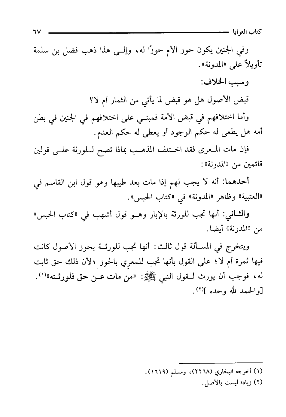 وفي الجنين يكون حوز الأم حوزًا له، وإلى هذا ذهب فضل بن سلمة تأويلًا على "المدونة".