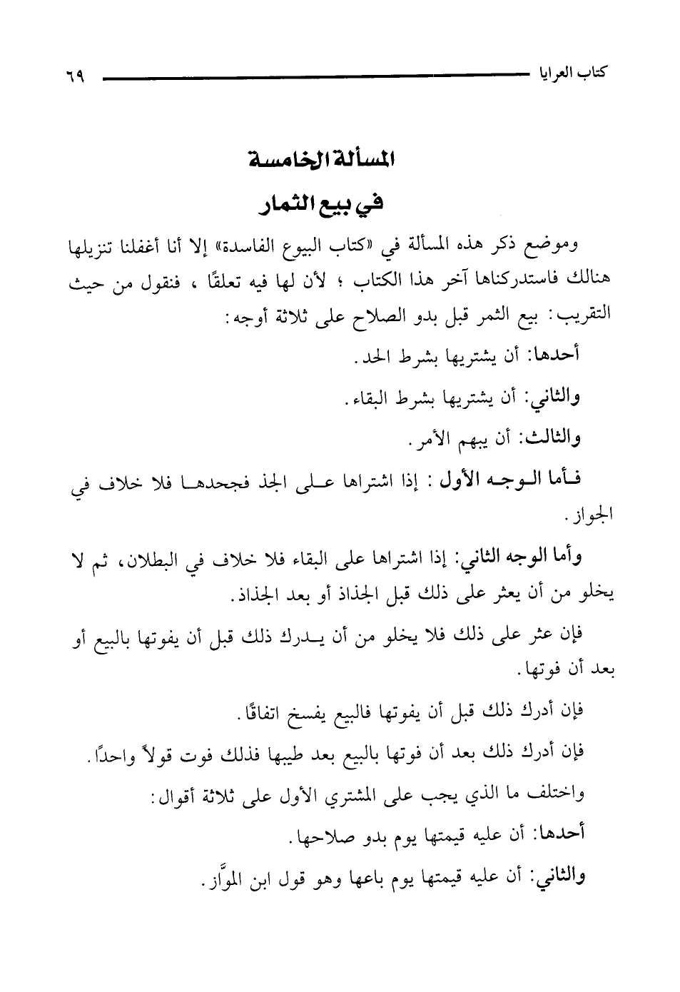 وموضع ذكر هذه المسألة في "كتاب البيوع الفاسدة" إلا أنا أغفلنا تنزيلها هنالك فاستدركناها آخر هذا الكتاب؛ لأن لها فيه تعلقًا، فنقول من حيث التقريب: بيع الثمر قبل بدو الصلاح على ثلاثة أوجه: