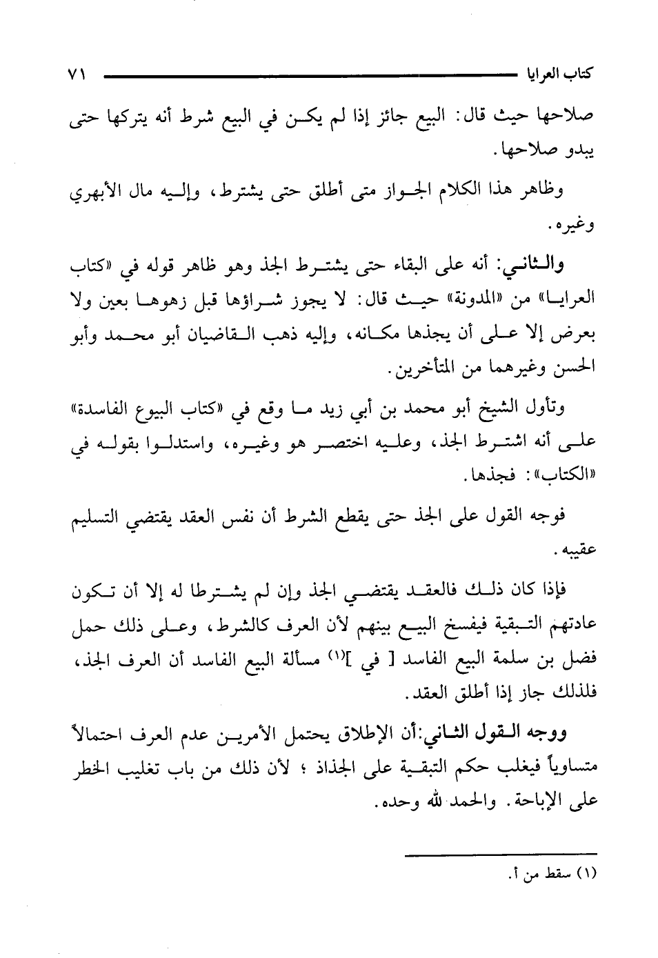 وتأول الشيخ أبو محمَّد بن أبي زيد ما وقع في "كتاب البيوع الفاسدة" على أنه اشترط الجذ، وعليه اختصر هو وغيره، واستدلوا بقوله في "الكتاب": فجذها.