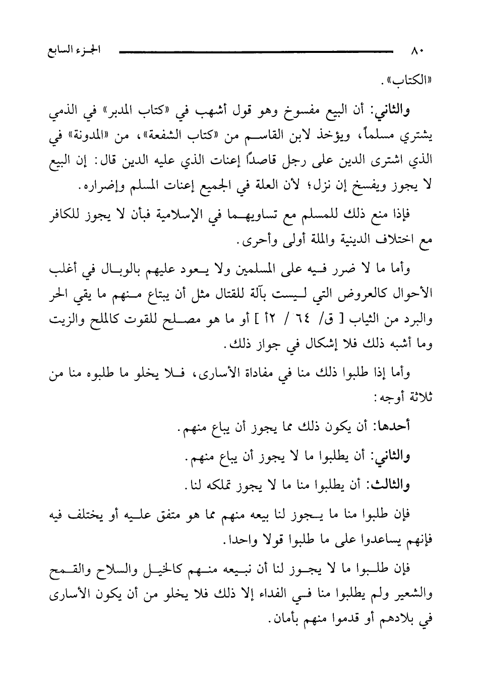 والثاني: أن البيع مفسوخ وهو قول أشهب في "كتاب المدبر" في الذمي يشتري مسلمًا، ويؤخذ لابن القاسم من "كتاب الشفعة"، من "المدونة" في الذي اشترى الدين على رجل قاصدًا إعنات الذي عليه الدين قال: إن البيع لا يجوز ويفسخ إن نزل؛ لأن العلة في الجميع إعنات المسلم وإضراره.