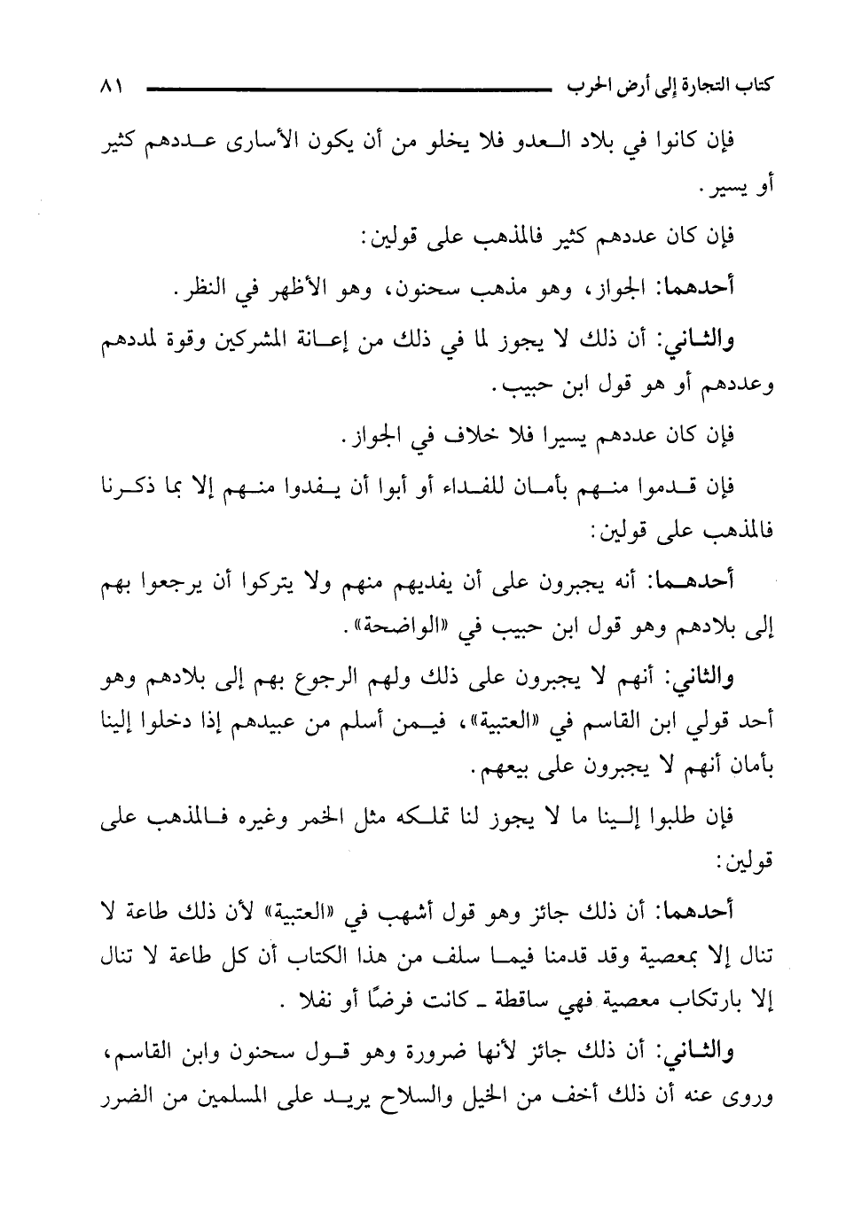 والثاني: أن ذلك لا يجوز لما في ذلك من إعانة المشركين وقوة لمددهم وعددهم أو هو قول ابن حبيب.