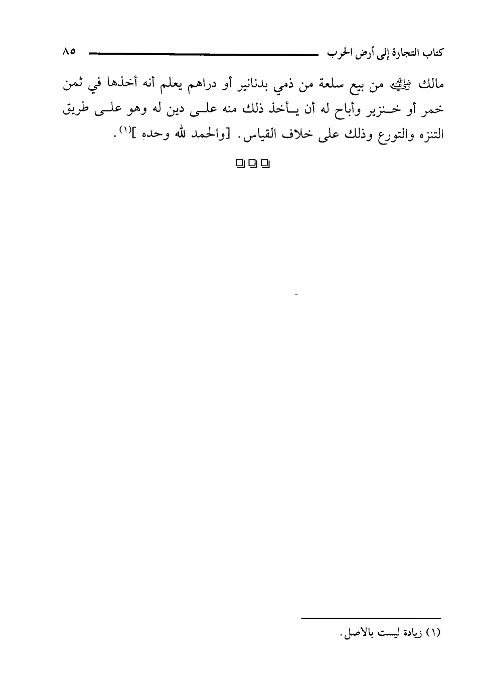 مالك - رضي الله عنه - من بيع سلعة من ذمي بدنانير أو دراهم يعلم أنه أخذها في ثمن خمر أو خنزير وأباح له أن يأخذ ذلك منه على دين له وهو على طريق التنزه والتورع وذلك على خلاف القياس. [والحمد لله وحده] (¬1).