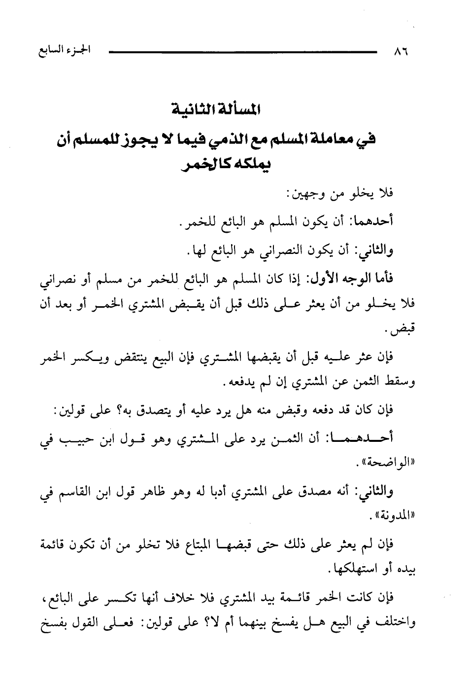 المسألة الثانية في معاملة المسلم مع الذمى فيما لا يجوز للمسلم أن يملكه كالخمر