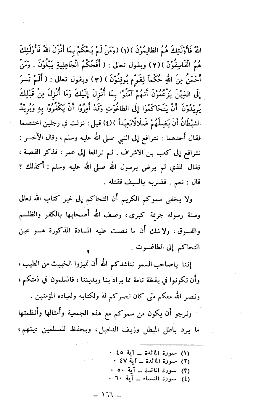 ولا يخفى سموكم الكريم أن التحاكم إلى غيركتاب الله تعالى وسنة رسوله جريمة كبرى، وصف الله أصحابها بالكفر والظلم والفسوق، ولا شك أن ما نصت عليه المادة المذكورة هو عين التحاكم إلى الطاغوت.