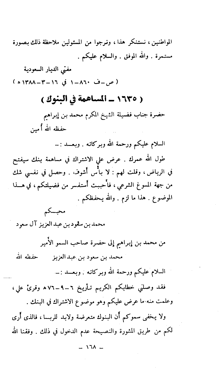 فقد وصلني خطابكم الكريم وتاريخ 6/9/76هـ وقرئ علي، وعلمت منه ما عرض عليكم وهو موضوع الاشتراك في البنك.