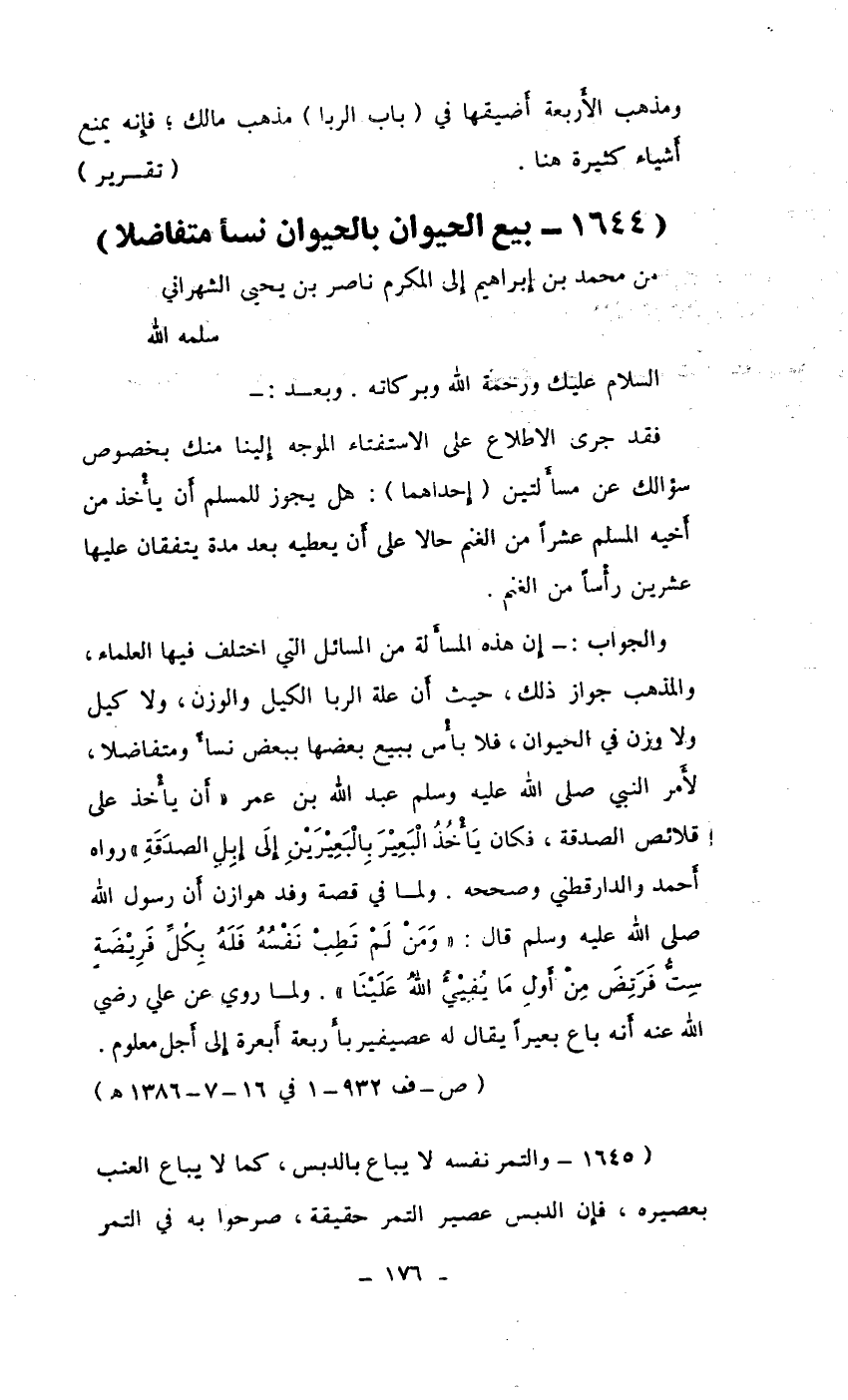 فقد جرى الإطلاع على الاستفتاء الموجه إلينا منك بخصوص سؤالك من مسألتين (إحداهما) : هل يجوز للمسلم أن يأخذ من أخيه المسلم عشراً من الغنم حالاً على أن يعطيه بعد مدة يتفقان عليها عشرين رأساً من الغنم.