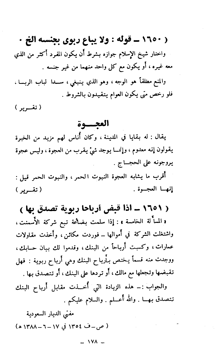"المسألة الخامسة": إذا سلمت بضاعة تبع شركة الأسمنت، واشتغلت الشركة في أموالها - فوردت مكائن، وأخذت مقاولات عمارات، وكسب أرباحاً من البنك، وقدموا لك بيان حسابك، ووجدت منه قسماً يختص بأرباح البنك وهي أرباح ربوية: فهل تقبضها وتجعلها مع ملك، أو تردها على البنك، أو تتصدق بها.