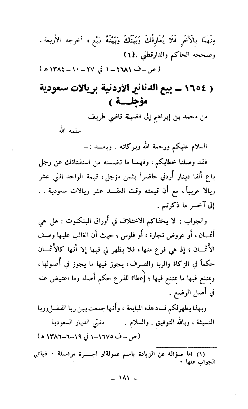 فقد وصلنا خطابكم، وفهمنا ما تضمنه من استفتائك عن رجل باع ألفا دينار أردني حاضراً بثمن مؤجل، قيمة الواحد اثني عشر ريالاً عربياً، مع أن قيمته وقت العقد عشر ريالات سعودية.. إلى آخر ما ذكرتم.