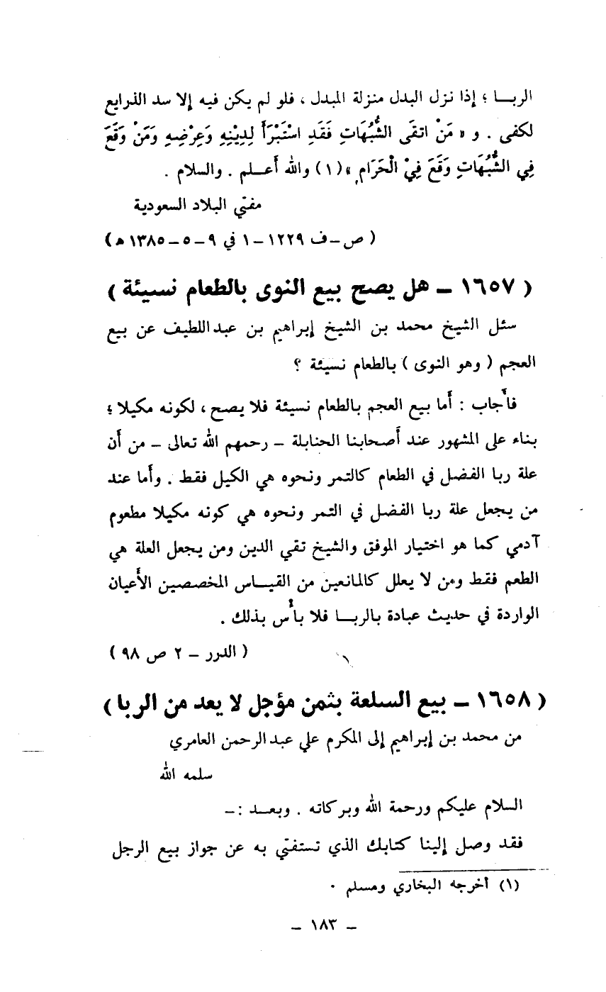 فأجاب: أما بيع العجم بالطعام نسيئة فلا يصح، لكونه مكيلا؛ بناءً على المشهور عند أصحابنا الحنابلة - رحمه الله تعالى - من أن علة ربا الفضل في الطعام كالتمر ونحوه هي الكيل فقط. وأما عند من يجعل علة ربا الفضل في التمر ونحوه هي كونه مكيلا مطعوم آدمي كما هو اختيار الموفق والشيخ تقي الدين ومن يجعل العلة هي الطعم فقط ومن لا يعلل كالمانعين من القياس المخصصين الأعيان الواردة في حديث عبادة بالربا فلا بأس بذلك.
