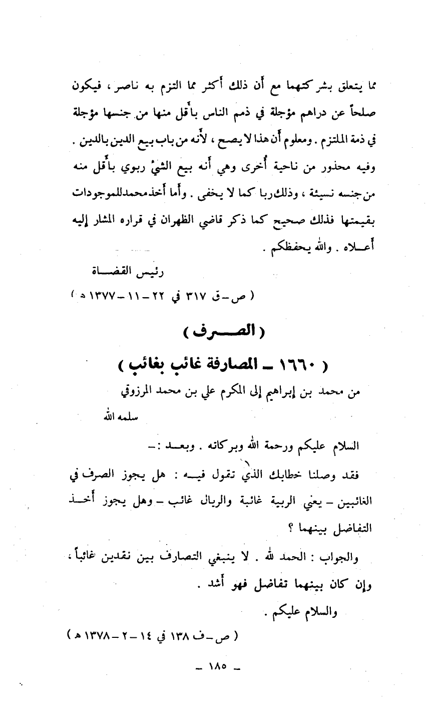 فقد وصلنا خطابك الذي تقول فيه: هل يجوز الصرف في الغائبين - يعني الربية غائبة والريال غائب - وهل يجوز أخذ التفاضل بينهما؟