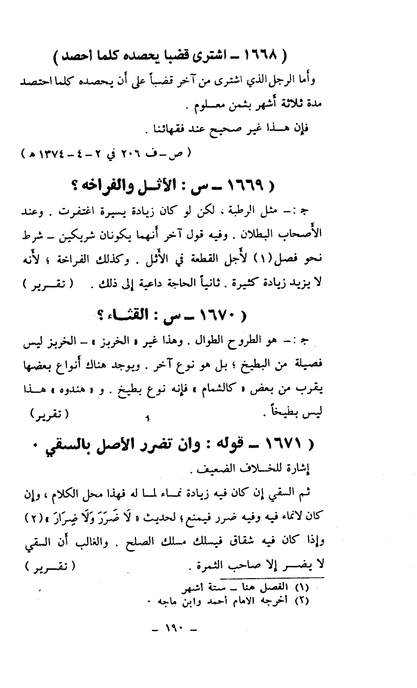 ثم السقي إن كان فيه زيادة نماء لما له فهذا محل الكلام، وإن كان لانماء فيه وفيه ضرر فيمنع؛ لحديث "لا ضرر ولا ضرار" (¬2) وإذا كان فيه شقاق فيسلك مسلك الصلح. والغالب أن السقي لا يضر إلا صاحب الثمرة. ... (تقرير)