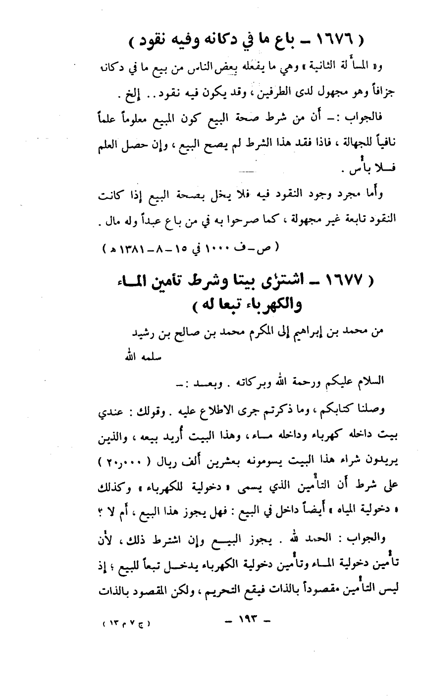وصلنا كتابكم، وما ذكرتم جرى الاطلاع عليه. وقولك: عندي بيت داخله كهرباء وداخله ماء، وهذا البيت أريد بيعه، والذين يريدون شراء هذا البيت يسومونه بعشرين ألف ريال (20.000) على شرط أن التأمين الذي يسمى "دخولية للكهرباء" وكذلك "دخولية المياه" أيضاً داخل في البيع: فهل يجوز هذا البيع، أم لا؟