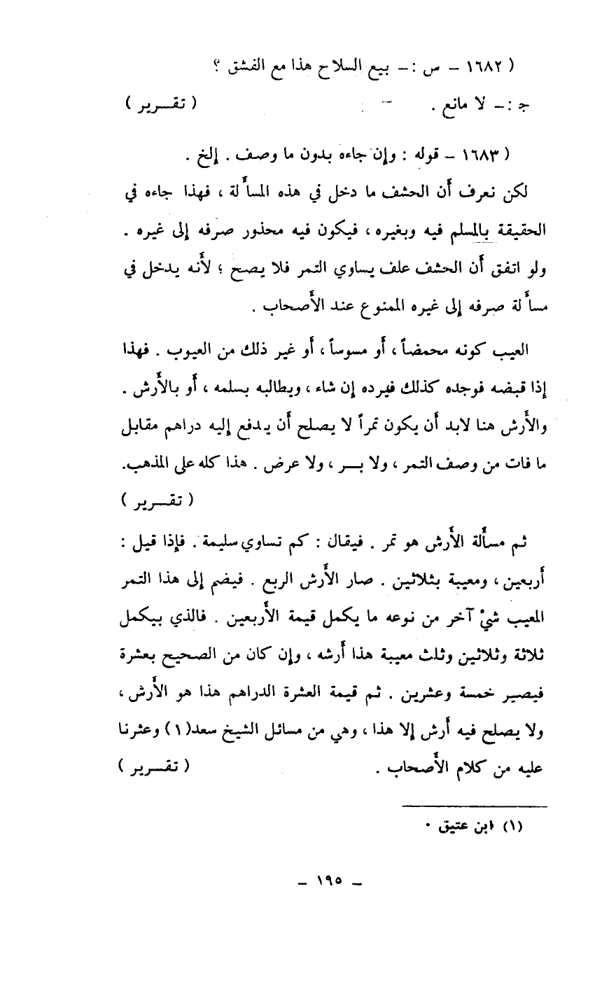 ثم مسألة الأرش هو تمر. فيقال: كم تساوي سليمة. فإذا قيل: أربعين، ومعيبة بثلاثين. صار الأرض الربع. فيضم إلى هذا التمر المعيب شيء آخر من نوعه ما يكمل قيمة الأربعين. فالذي بيكمل ثلاثة وثلاثين وثلث معيبة هذا أرشه، وإن كان من الصحيح بعشرة فيصير خمسة وعشرين. ثم قيمة العشر الدراهم هذا هو الأرش. ولا يصلح فيه أرش إلا هذا، وهي من مسائل الشيخ سعد (¬1) وعثرنا عليه من كلام الأصحاب. ... (تقرير)