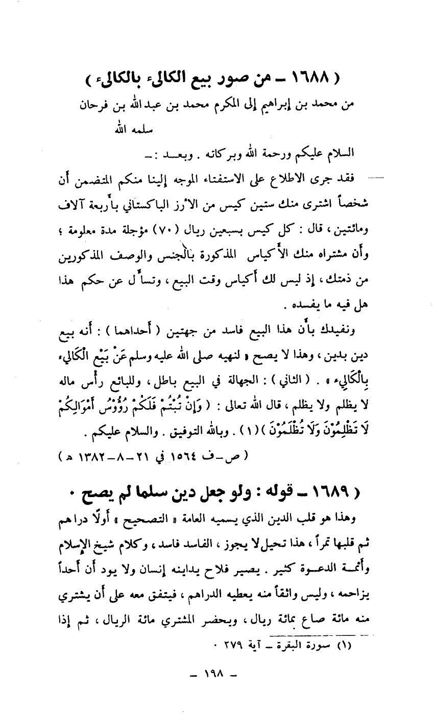 وهذا هو قلب الدين الذي يسميه العامة " التصحيح " أولاً دراهم ثم قلبها تمرا، هذا تحيل لا يجوز، الفاسد فاسد، وكلام شيخ الإسلام وأثمة الدعوة كثير. يصير فلاح يداينه إنسان ولا يود أن أحداً يزاحمه، وليس واثقاً منه يعطيه الدراهم، فيتفق معه على أن يشتري منه مائة صاع بمائة ريال، ويحضر المشتري مائة الريال، ثم إذا