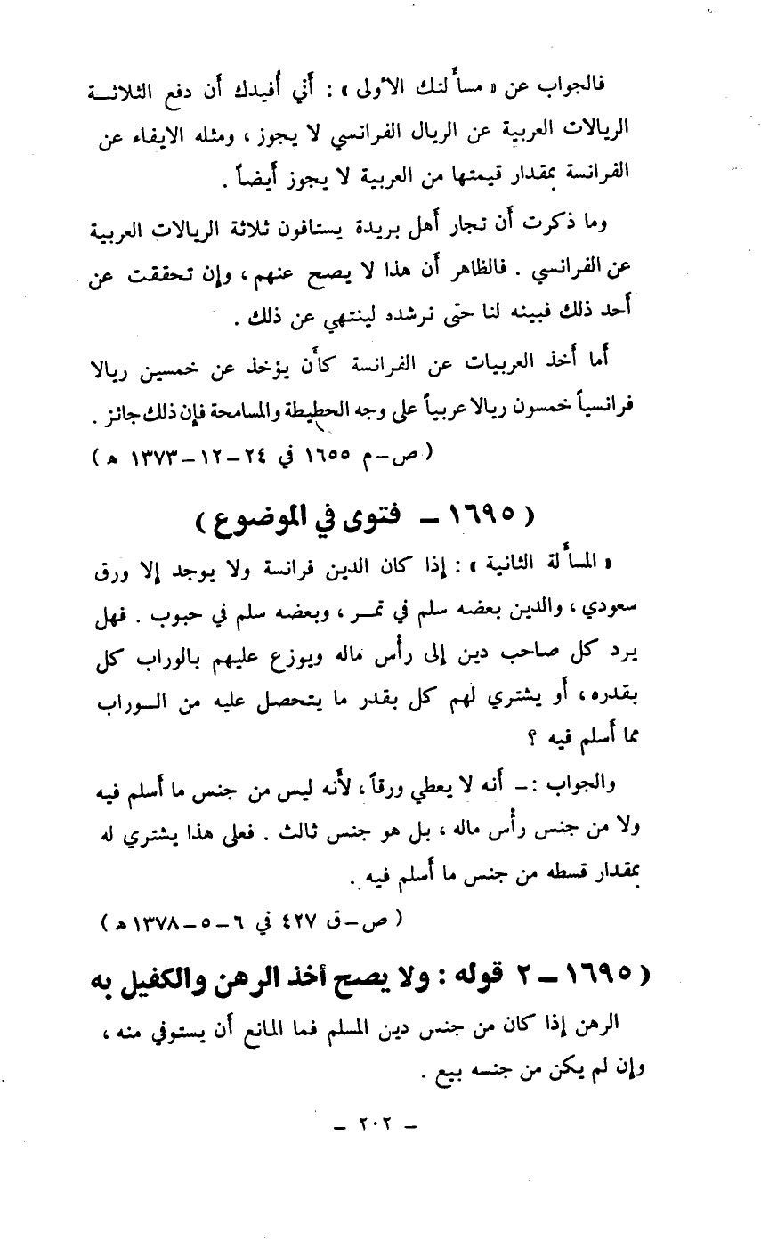 فالجواب عن "مسألتك الأولى": أني أفيدكم أن دفع الثلاثة الريالات العربية عن الريال الفرانسي لا يجوز، ومثله الايفاء عن الفرانسة بمقدار قيمتها من العربية لا يجوز أيضاً.