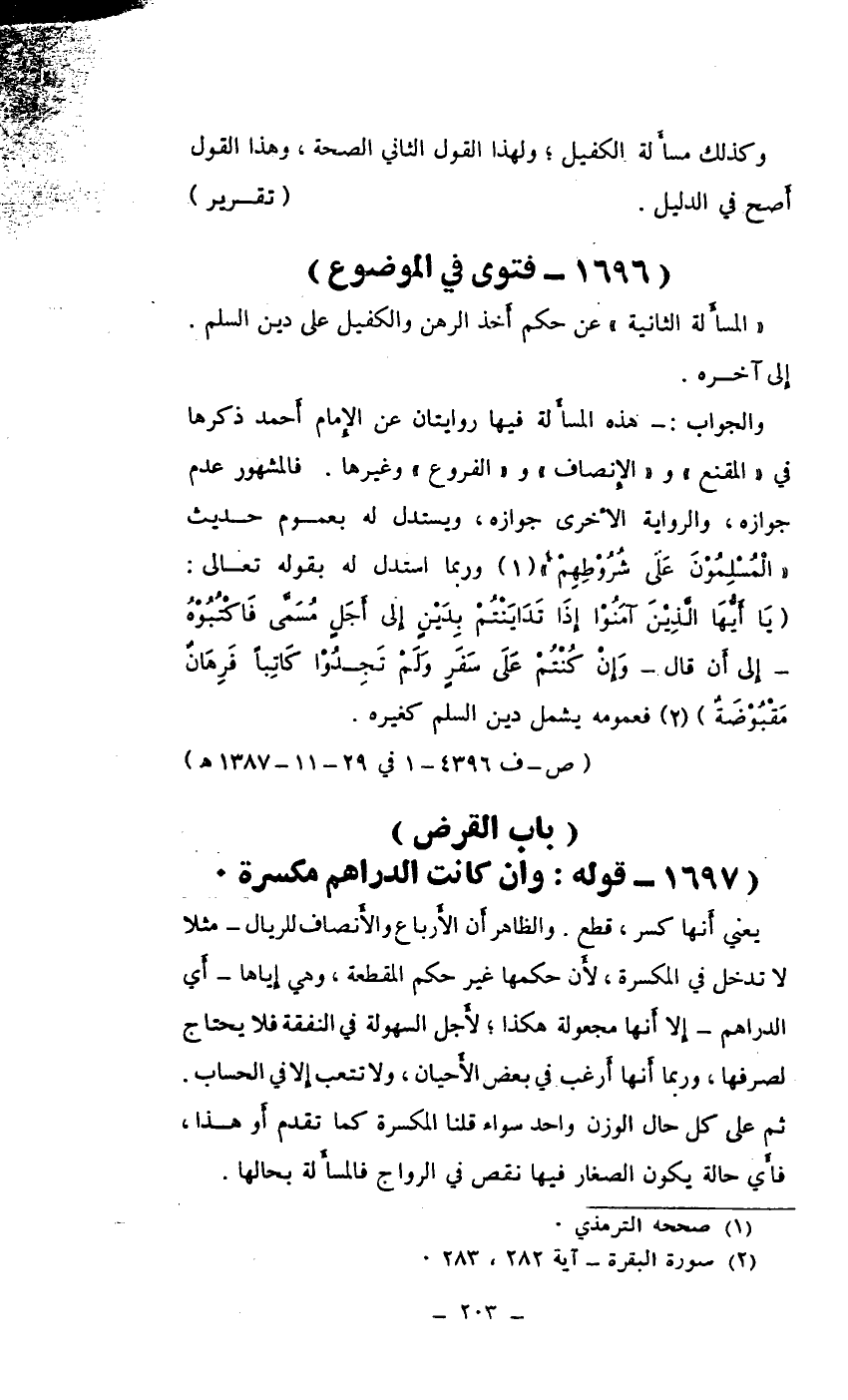 والجواب: هذه المسألة فيها روايتان عن الإمام أحمد ذكرها في "المقنع" و "الإنصاف" و "الفروع" وغيرها. فالمشهور عدم جوازه، والرواية الأخرى جوازه، ويستدل له بعموم حديث "المسلمون على شروطهم" (¬1) وربما استدل له بقوله تعالى: (يا أيها الذين آمنوا إذا تداينتم بدين إلى أجل مسمى فاكتبوه - إلى أن قال - وإن كنتم على سفر ولم تجدوا كاتباً فرهان مقبوضة) (¬2) فعمومه يشمل دين السلم كغيره.