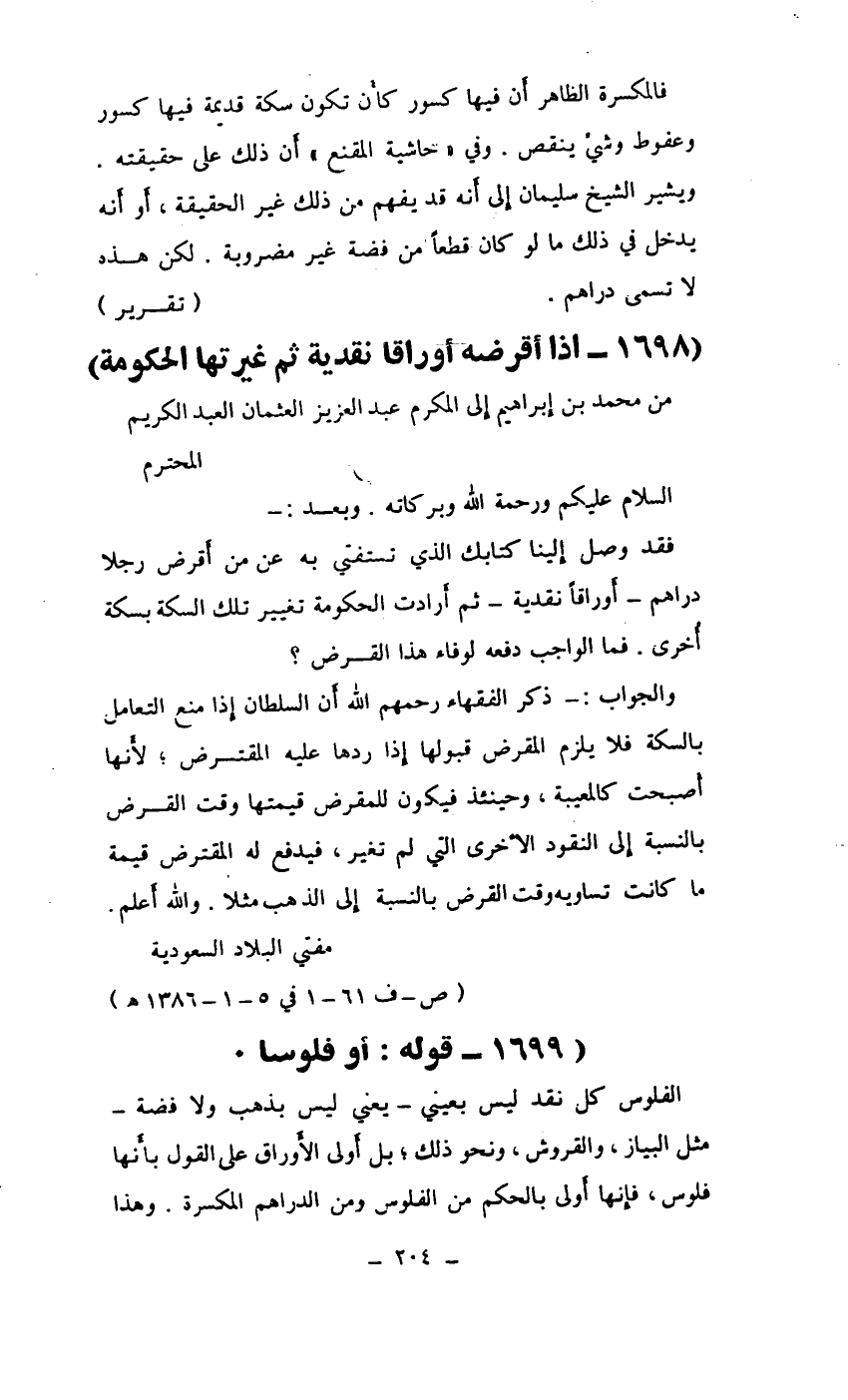 فقد وصل إلينا كتابك الذي تستفتي به من أقرض رجلا دراهم - أوراقاً نقدية - ثم أرادت الحكومة تغيير تلك السكة بسكة أخرى. فما الواجب فدعه لوفاء هذا الفرض؟