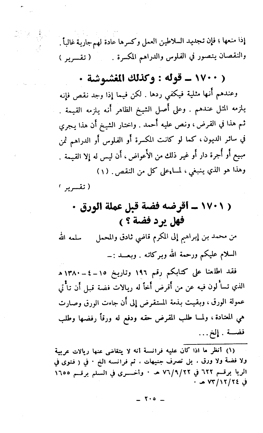 (¬1) انظر ما إذا كان عليه فرانسة أنه لا يتقاضى عنها ريالات عربية ولا فضة ولا ورق، بل تصرف جنيهات، ثم فرانسه الخ. في (فتوى في الربا برقم 622 في 22/9/76هـ. واخرى في السلم برقم 1655 في 24/12/73هـ.