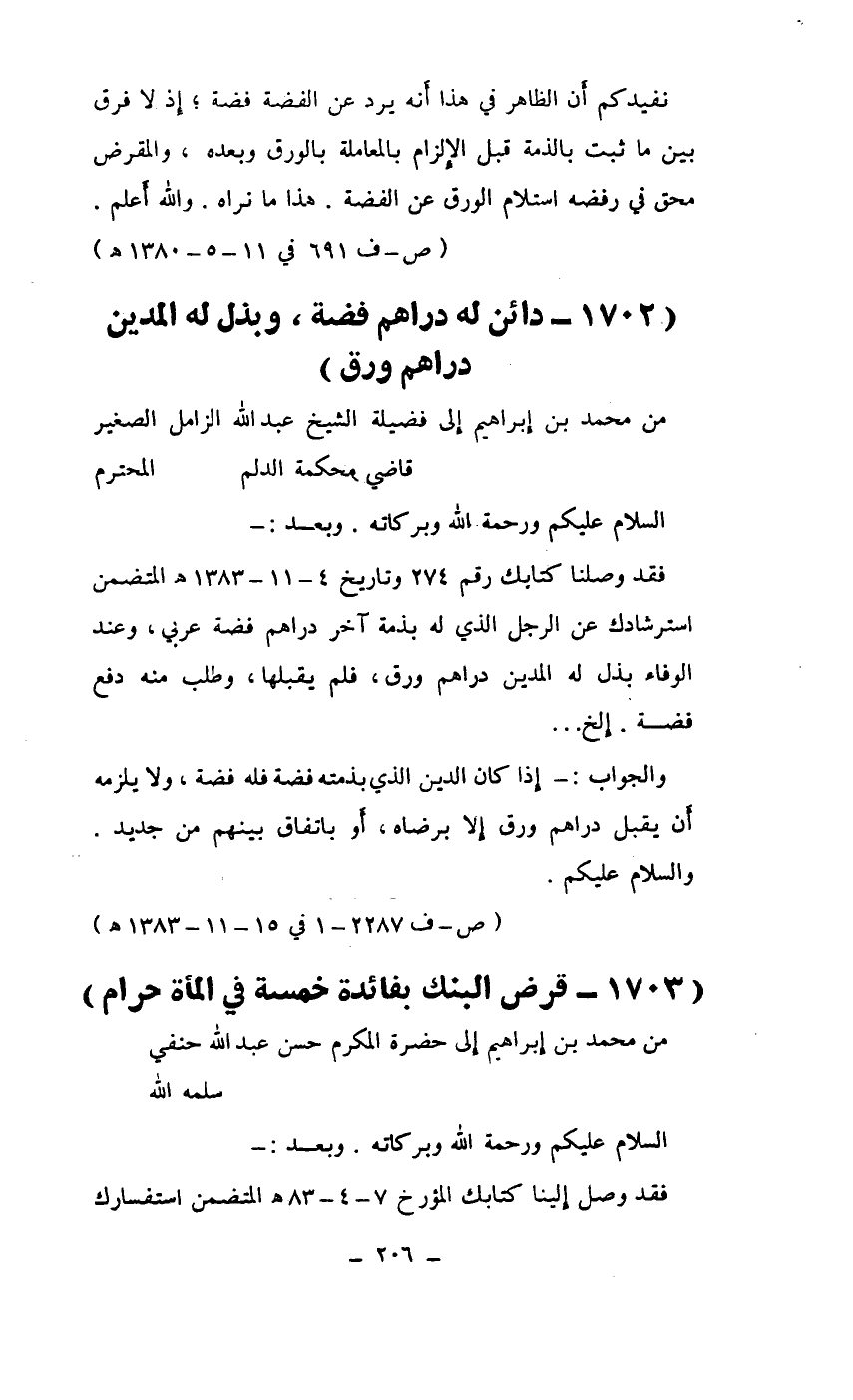فقد وصلنا كتابك رقم 274 وتاريخ 4-11-1383هـ المتضمن استرشادك عن الرجل الذي له بذمة آخر دراهم فضة عربي، وعند الوفاء بذل له المدين دراهم ورق، فلم يقبلها، وطلب منه دفع فضة. الخ ...