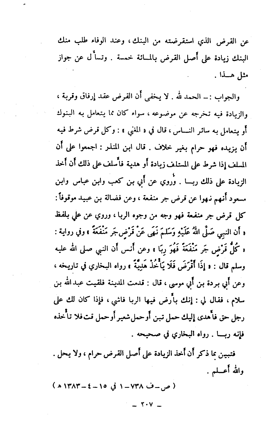 والجواب: الحمد لله. لا يخفى أن القرض عقد إرفاق وقربة، والزيادة فيه تخرجه عن موضوعه، سواء كان مما يتعامل به البنوك أن أو يتعامل به سائر الناس، قال في "المغني": وكل قرض شرط فيه أن يزيده فهو حرام بغير خلاف. قال ابن المنذر: اجمعوا على أن المسلف إذا شرط على المستلف زيادة أو هدية فأسلف على ذلك أن أخذ الزيادة على ذلك ربا، وروي عن أبي بن كعب وابن عباس وابن مسعود أنهم نهوا عن قرض جر منفعة، وعن فضالة بن عبيد موقوفاً: كل قرض جر منفعة فهو وجه من وجوه الربا، وروي عن علي بلفظ "أن النبي صلى الله عليه وسلم نهى عن قرض جر منفعة" وفي رواية: "كل قرض جر منفعة فهو ربا" وعن أنس أن النبي صلى الله عليه وسلم قال: "إذا أقرض فلا يأخذ هدية" رواه البخاري في تاريخه، وعن أبي بردة بن أبي موسى، قال: قدمت المدينة فلقيت عبد الله بن سلام، فقال لي: إنك بأرض فيها الربا فاشي، فإذا كان لك على رجل حق فأهدى إليك حمل تبن أو حمل شعير أو حمل قت فلا تأخذه فإنه ربا. رواه البخاري في صحيحه.