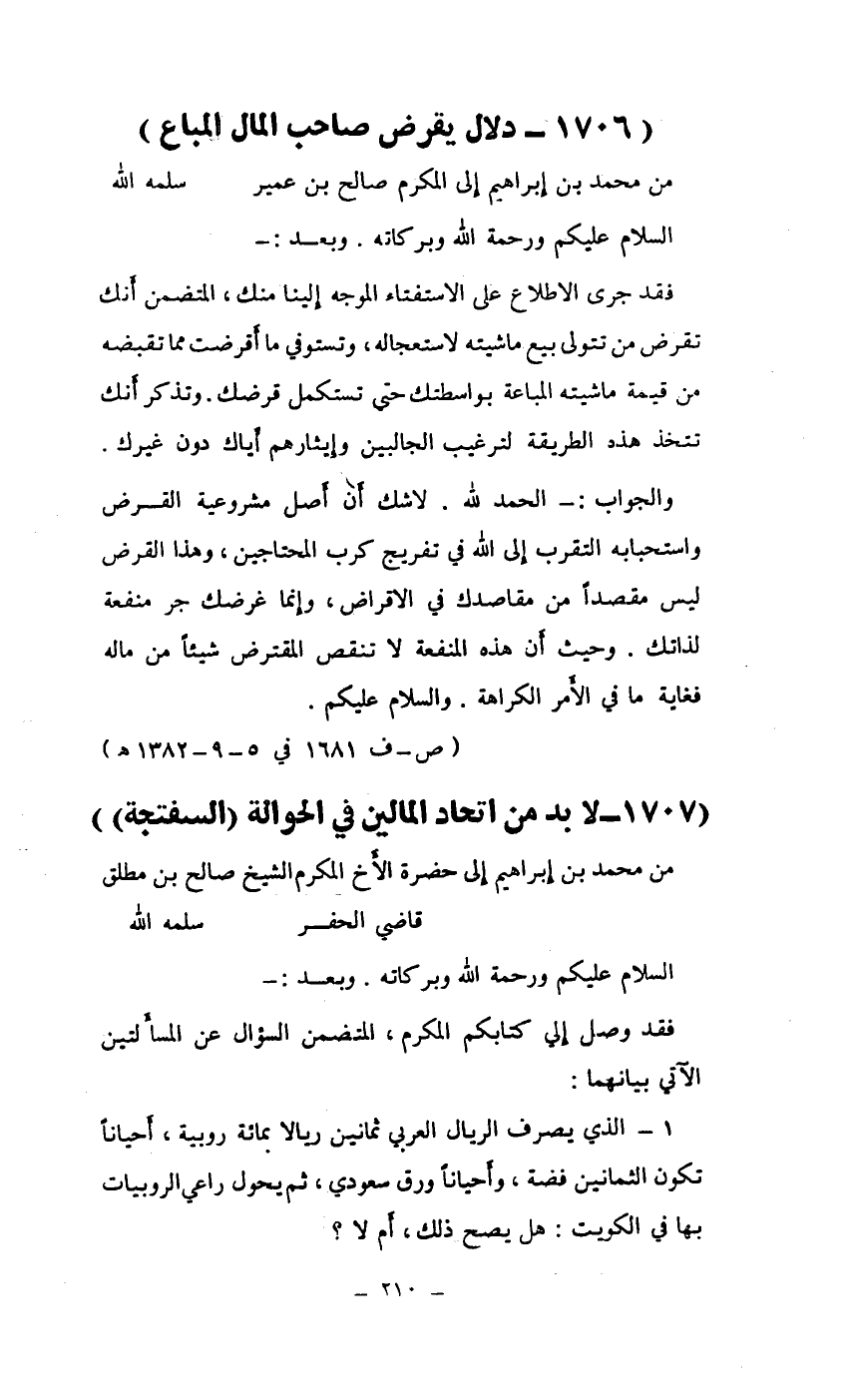 فقد جرى الاطلاع على الاستفتاء الموجه إلينا منك، المتضمن أنك تقرض من تتولى بيع ماشيته المباعة بواسطتك حتى تستكمل قرضك. وتذكر أنك تتخذ هذه الطريقة لترغيب الجالبين وإيثارهم إياك دون غيرك.
