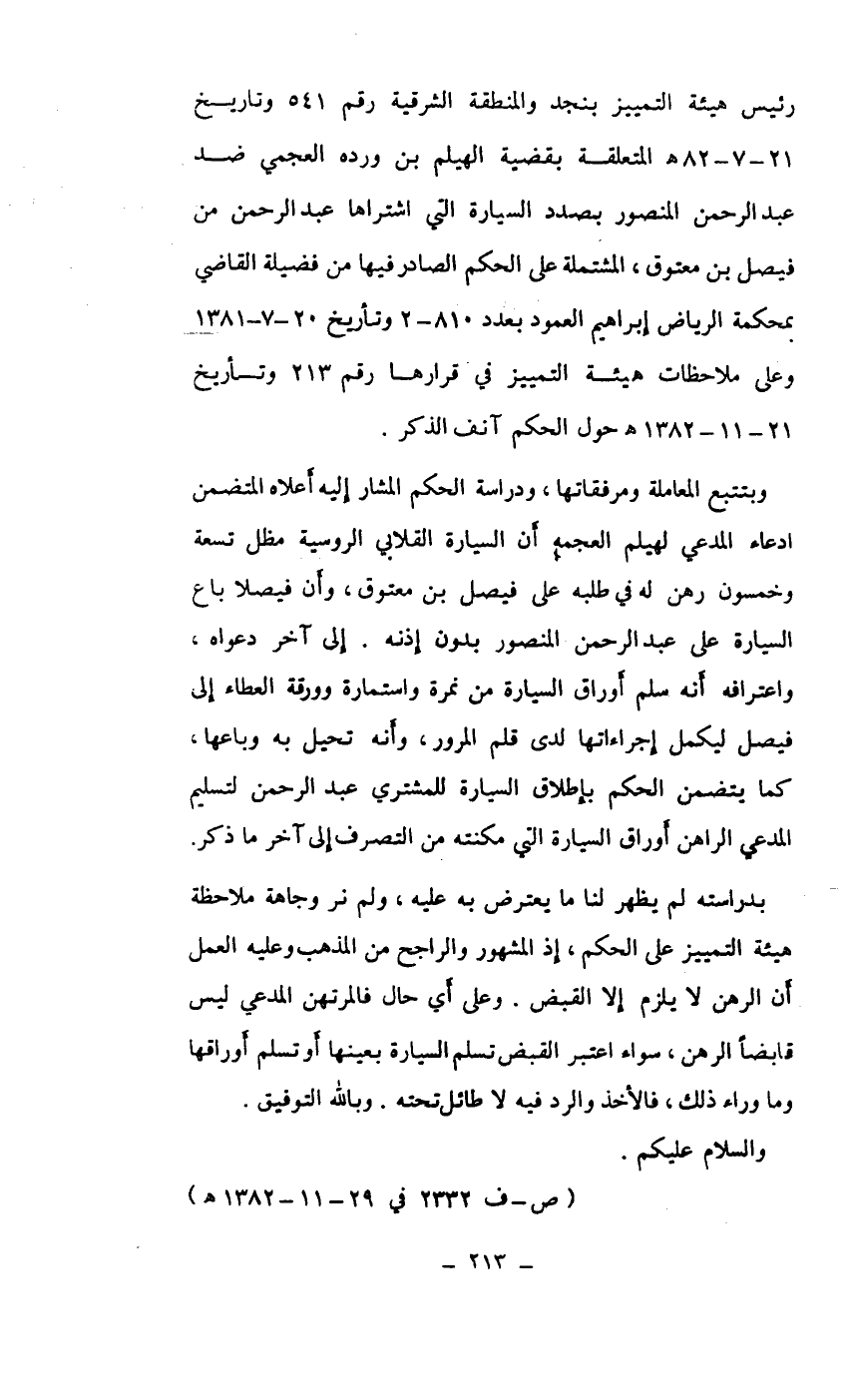 رئيس هيئة التمييز بنجد والمنطقة الشرقية رقم 541 وتاريخ 21-7-82هـ المتعلقة بقضية الهيلم بن ورده العجمي ضد عبد الرحمن المنصور بصدد السيارة التي اشتراها عبد الرحمن من فيصل بن معتوق، المشتملة على الحكم الصادر فيها من فضيلة القاضي بمحكمة الرياض إبراهيم العمود بعدد 810-2 وتاريخ 20-7-1381 وعلى ملاحظات هيئة التمييز في قرارها رقم 213 وتأريخ 21-11-1382هـ حول الحكم آنف الذكر.