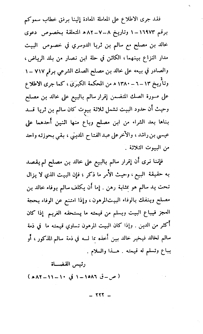فقد جرى الإطلاع على المعاملة المعادة إلينا برفق خطاب سموكم برقم 16973-1 وتاريخ 8-7-82هـ المتعلقة بخصوص دعوى خالد بن مصلح مع سالم بن ثريا الدوسري في خصوص البيت مدار النزع بينهما، والكائن في حلة ابن نصار من بلد الرياض، والصادر في بيعه على خالد بن مصلح الصاك الشرعي برقم717-1وتأريخ 13-6-1380هـ من المحكمة الكبرى، كما جرى الإطلاع على صورة الصك المتضمن إقرار سالم بالبيع على خالد بن مصلح وحيث أن حدود البيت تشمل ثلاثة بيوت كان سالم بن ثريا قد بناها بعد الشراء من ابن مصلح وباع منها اثنين أحدهما علي عيسى بن راشد، والآخر على عبد الفتاح المديني، بقي بحوزته واحد من البيوت الثلاثة.