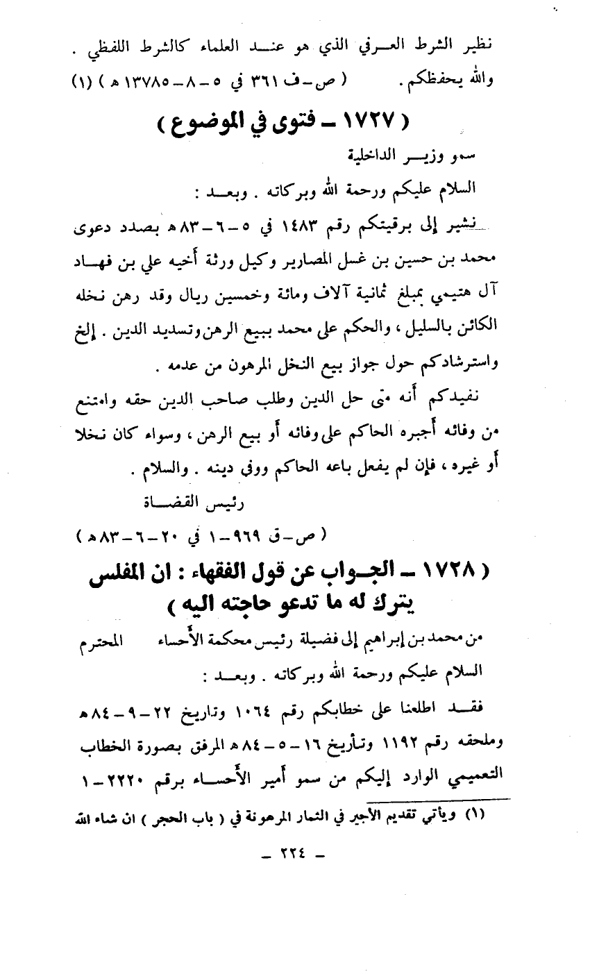 من محمد بن إبراهيم إلى فضيلة رئيس محكمة الاحساء ... المحترم