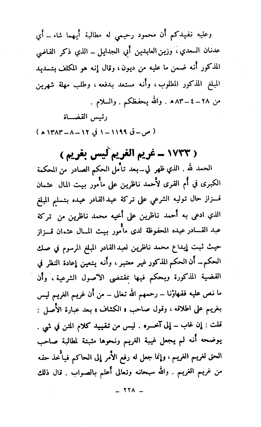وعليه نفيدكم أن محمود رحيمي له مطالبة أيهما شاء - أي عدنان السعدي. وزين العابدين أبي الجدايل - الذي ذكر القاضي المذكور أنه ضمن ما عليه من ديون، وقال إنه هو المكلف بتسديد المبلغ المذكور المطلوب، وأنه مستعد بدفعه، وطلب مهلة شهرين من 28-4-83هـ. والله يحفظكم. والسلام.