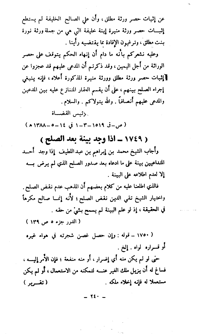 عن إثبات حصر ورثة مطلق وورثة منيرة المذكورة أعلاه، فإنه ينبغي إجراء الصلح بينهم، على أن يقسم العقار المتنازع عليه بين المدعين والمدعى عليهم أنصافاً. والله يتولاكم. والسلام.