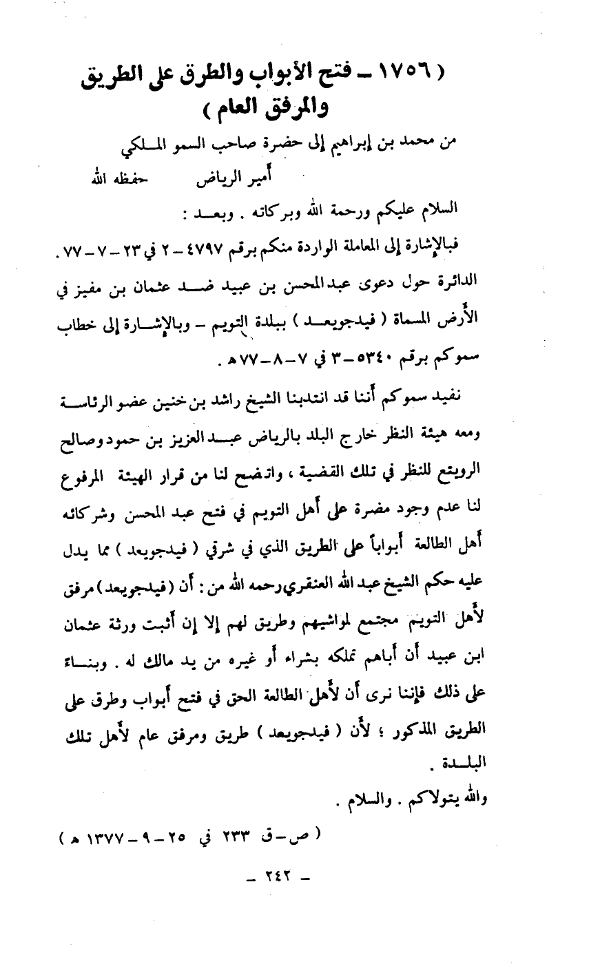 نفيد سموكم أننا قد انتدبنا الشيخ راشد بن خنين عضو الرئاسة ومعه هيئة النظر خارج البلد بالرياض عبد العزيز بن حمود وصالح الرويتع للنظر في تلك القضية، وأتضح لنا من قرار الهيئة المرفوع لنا عدم وجود مضرة على أهل التويم في فتح عبد المحسن وشركائه أهل الطالعة أبواباً على الطريق الذي في شرقي (فيدرجويعد) مما يدل عليه حكم الشيخ عبد الله العنقري رحمه الله من: أن (فيدجويعد) مرفق لأهل التويم مجتمع لمواشيهم وطريق لهم إلا إن أثبت ورثة عثمان ابن عبيد أن أباهم تملكه بشراء أو غيره من يد مالك له. وبناءً على ذلك فإننا نرى أن لأهل الطالعة الحق في فتح أبواب وطرق على الطريق المذكور؛ لأن (فيدجويعد) طريق ومرفق عام لأهل تلك البلدة.