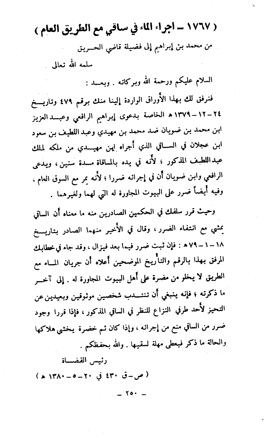 فنرفق لك بهذا الأوراق الواردة إلينا منك برقم 479 وتاريخ 24-12-1379هـ الخاصة بدعوى إبراهيم الرافعي وعبد العزيز ابن محمد بن ضويان ضد محمد بن مهيدي وعبد اللطيف بن سعود ابن عجلان في الساقي الذي أجراه ابن مهيدي من ملكه لملك عبد اللطيف المذكور؛ لأنه في يده بالمساقاة مدة سنين، ويدعى الرافعي وابن ضويان أن في إجرائه ضرار؛ لأنه يمر مع السوق العام. وفيه أيضاً ضرر على البيوت المجاورة له التي لهما ولغيرهما.
