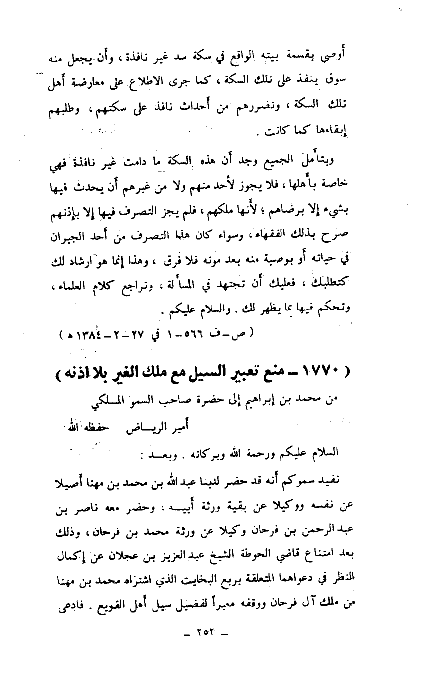 نفيد سموكم أنه قد حضر لدينا عبد الله بن محمد بن مهنا أصيلا عن نفسه ووكيلا عن بقية ورثة أبيه، وحضر معه ناصر بن عبد الرحمن بن فرحان وكيلا عن ورثة محمد بن فرحان، وذلك بعد امتناع قاضي الحوطة الشيخ عبد العزيز بن عجلان عن إكمال النظر في دعواهما المتعلقة بربع البخايت الذي اشتراه محمد بن منا من ملك آل فرحان ووقفه معبراً لفضيل سيل أهل القويع. فادعى