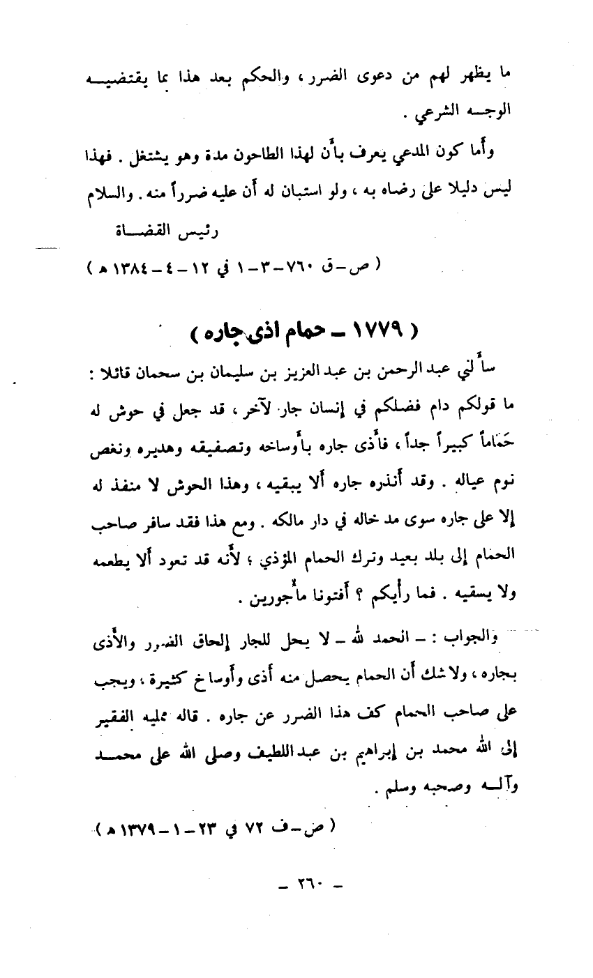 سألني عبد الرحمن بن عبد العزيز بن سليمان بن سحمان قائلاً: ما قولكم دام فضلكم في إنسان جار لآخر، قد جعل في حوش له حماماً كبيراً جداً، فأذى جاره بأوساخه وتصفيقه وهديره ونغص عياله. وقد أنذره جاره ألا يبقيه، وهذا الحوش لا منفذ له إلا على جاره سوى مد خاله في دار مالكه. ومع هذا فقد سافر صاحب الحمام إلى بلد بعيد وترك الحمام المؤذي؛ لأنه قد تعود ألا يطعمه ولا يسقيه. فما رأيكم؟ أفتونا مأجورين.