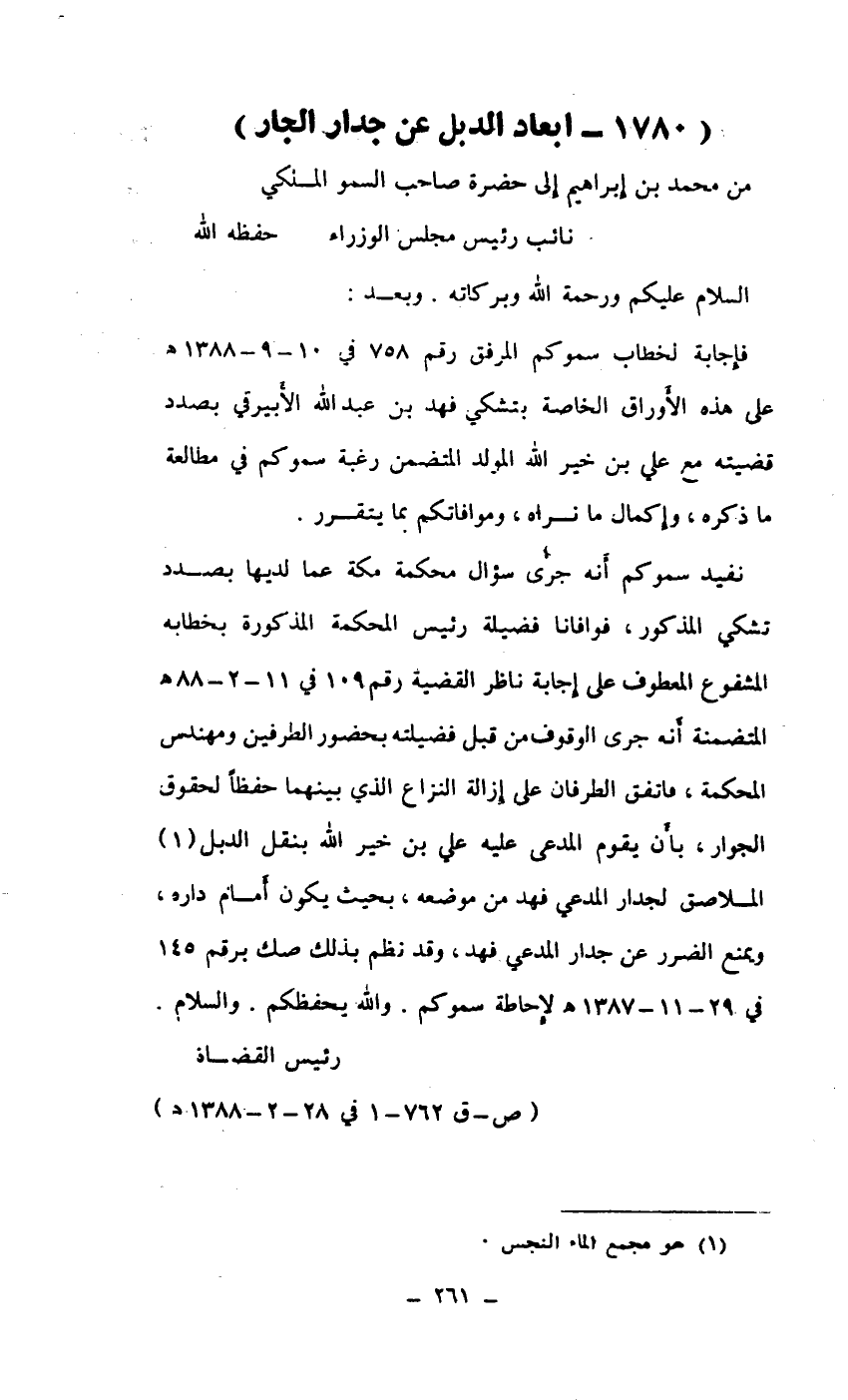 نفيد سموكم أنه جرى سؤال محكمة مكة عما لديها بصدد تشكي المذكور، فوافانا فضيلة رئيس المحكمة المذكورة بخطابه المشفوع المعطوف على إجابة ناظر القضية رقم 109 في 11-2-88هـ المتضمنة أن جرى الوقوف من قبل فضيلته بحضور الطرفين ومهندس المحكمة، فاتفق الطرفان على إزالة النزاع الذي بينهما حفظاً لحقوق الجوار، بأن يقوم المدعى عليه علي بن خير الله بنقل الدبل (¬1) الملاصق لجدار المدعي فهد من موضعه، بحيث يكون أمام داره، ويمنع الضرر عن جدار المدعي فهد، وقد نظم بذلك صك برقم 145 في 29-11-1387هـ لإحاطة سموكم. والله يحفظكم. والسلام. رئيس القضاة