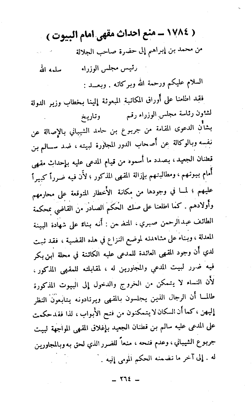 فقد اطلعنا على أوراق المكاتبة المبعوثة إلينا بخطاب وزير الدولة لشؤون رئاسة مجلس الوزراء رقم ... وتاريخ ... بشأن الدعوى المقامة من جربرع بن حامد الشيباني بالإصالة عن نفسه وبالوكالة عن أصحاب الدور المجاورة لبيته، ضد سالم بن قطنان الجعيد، بصدد ما أسموه من قيام المدعى عليه بإحداث مقهى أمام بيوتهم، ومطالبتهم بإزالة المقهى المذكورة؛ لأن فيه ضرراً كبراً عليهم؛ لما في وجودها من مكانة الأخطار المتوقعة على محارمهم وأولادهم. كما اطلعنا على صك الحكم الصادر من القاضي بمحكمة الطائف عبد الرحمن صبري، المتضمن: أنه بناءً على شهادة البينة المعدلة، وبناء على مشاهدته لموضوع النزاع في هذه القضية، فقد ثبت لدي أن وجود المقهى العائدة للمدعى عليه الكائنة في محلة ابن بكر فيه ضرر لبيت المدعي والمجاورين له، لمقابلته للمقهى المذكور، لأن النساء لا يتمكن من الخروج والدخول إلى البيوت المذكورة طالما أن الرجال الذين يجلسون بالمقهى ويرتادونه يتابعون النظر إليهن، كما أن السكان لا يتمكنون من فتح الأبواب، لذا فقد حكمت على المدعى عليه سالم بن فطنان الجعيد بإغلاق المقهى المواجهة لبيت جربوع الشيباني، وعدم فتحه، منعاً للضرر الذي لحق به وبالمجاورين له. إلى آخر ما تضمنه الحكم المومي إليه.