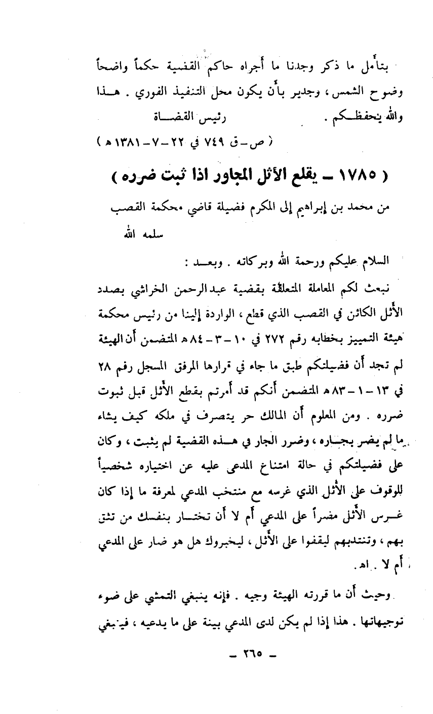 نبعث لكم المعاملة المتعلقة بقضية عبد الرحمن الخراشي بصدد الاثل الكائن في القصب الذي قطع، الواردة إلينا من رئيس محكمة هيئة التمييز بخطابه رقم 272 في 10-3-84هـ المتضمن أن الهيئة لم تجد أن فضيلتكم طبق ما جاء في قرارها المرفق المسجل رقم 28 في 13-1-83هـ المتضمن أنكم قد أمرتم بقطع الأثل قبل ثبوت ضرره. ومن المعلوم أن الملك حر يتصرف في ملكه كيف يشاء ما لم يضر بجاره، وضرر الجار في هذه القضية لم يثبت، وكان على فضيلتكم في حالة امتناع المدعى عليه عن اختياره شخصياً للوقوف على الاثل الذي غرسه مع منتخب المدعي لمعرفة ما إذا كان غرس الأثل مضراً على المدعي أم لا أن تختار بنفسك من تثق بهم، وتنتدبهم ليقفوا على الأثل، ليخبروك هل هو ضار على المدعي أم لا. اهـ.