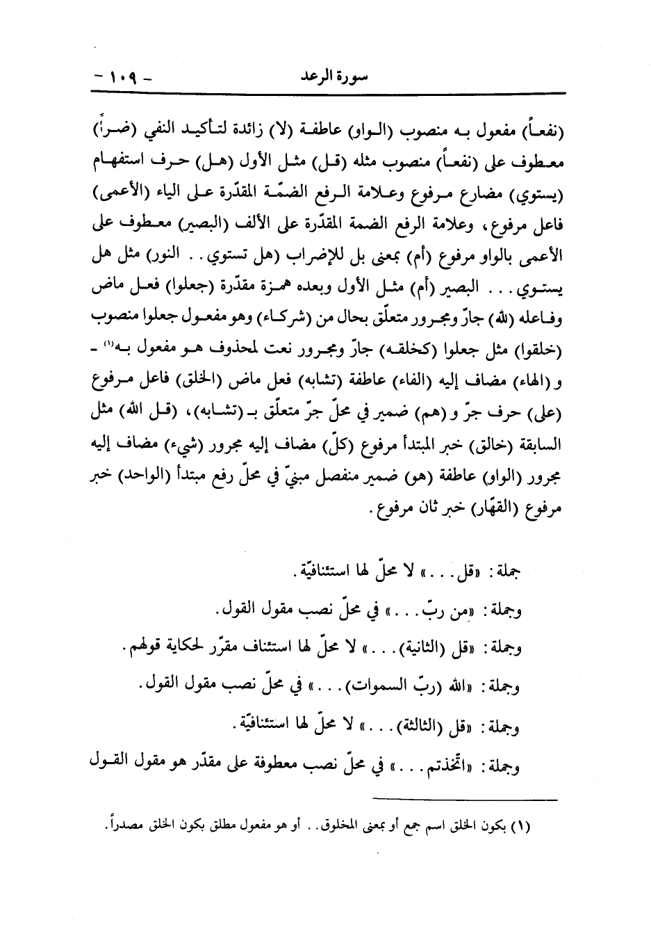 (24) (انظر) فعل أمر، والفاعل ضمير مستتر تقديره أنت (كيف) اسم استفهام مبني في محلّ نصب حال عامله (كذبوا) وهو مثل أشركوا (على أنفس) جار ومجرور متعلق ب (كذبوا) ، و (هم) ضمير مضاف إليه (الواو) عاطفة- أو استئنافية- (ضلّ) مثل افترى (عن) حرف جر و (هم) ضمير في محلّ جر متعلق ب (ضلّ) بتضمينه معنى غاب (ما) اسم موصول مبني في محلّ رفع فاعل، والعائد محذوف «1» ، (كانوا) مثل كنتم (يفترون) مثل تزعمون.