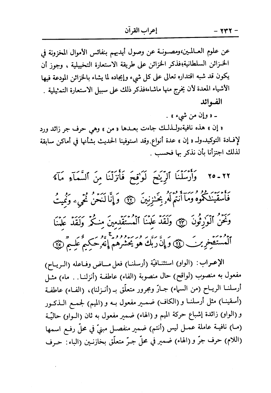 منصوب (الواو) عاطفة (من النخل) جار ومجرور متعلق بمحذوف خبر مقدم (من طلع) جار ومجرور بدل من الأول و (ها) ضمير مضاف إليه (قنوان) مبتدأ مؤخر مرفوع (دانية) نعت لقنوان مرفوع (الواو) عاطفة (جنّات) معطوف على نبات منصوب مثله وعلامة النصب الكسرة (من أعناب) جار ومجرور متعلق بنعت لجنات (الواو) عاطفة في الموضعين (الزيتون، الرمان) اسمان معطوفان بحرفي العطف على نبات منصوبان مثله (مشتبها) حال من الزيتون والرمان أي ورقهما (الواو) عاطفة (غير) معطوف على (مشتبها) منصوب (متشابه) مضاف إليه مجرور (انظروا) فعل أمر مبني على حذف النون ... والواو فاعل (إلى ثمر) جار ومجرور متعلق ب (انظروا) ، و (الهاء) ضمير مضاف إليه (إذا) ظرف للمستقبل مجرد من الشرط في محلّ نصب متعلق ب (انظروا) ، (أثمر) فعل ماض، والفاعل هو أي الثمر (الواو) عاطفة (ينع) معطوف على ثمر مجرور و (الهاء) مضاف إليه (إن) حرف مشبه بالفعل- ناسخ- (في) حرف جر (ذلكم) اسم إشارة مبني في محلّ جر متعلق بمحذوف خبر مقدم و (اللام) للبعد و (الكاف) للخطاب و (الميم) حرف لجمع الذكور (اللام) لام الابتداء تفيد التوكيد (آيات) اسم إن مؤخر منصوب وعلامة النصب الكسرة (لقوم) جار ومجرور متعلق بنعت لآيات (يؤمنون) مضارع مرفوع ... والواو فاعل.