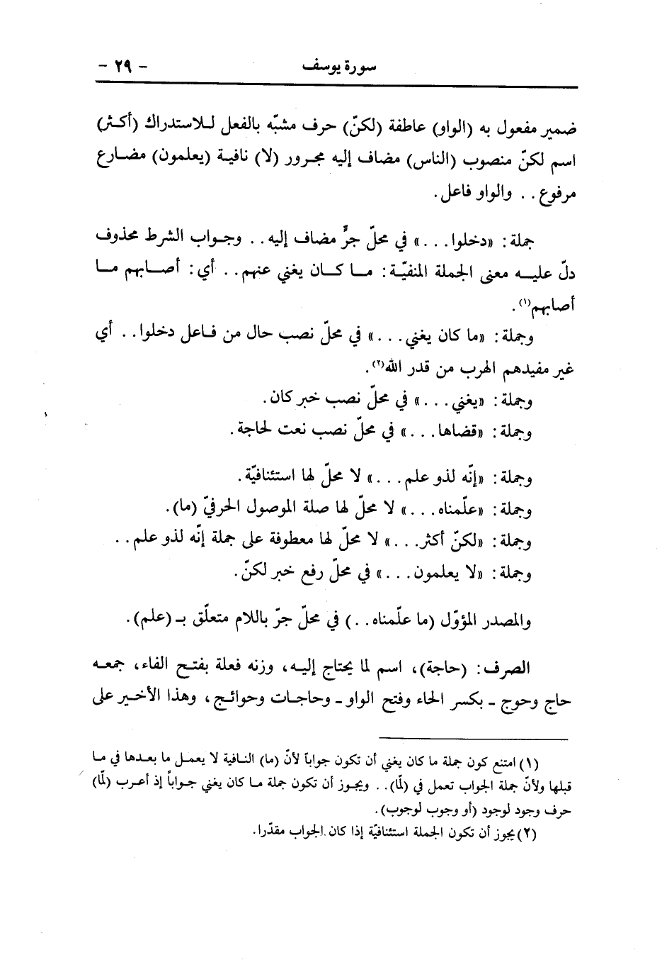 (أحل) فعل ماض مبني للمجهول (اللام) حرف جرّ و (كم) ضمير في محلّ جرّ متعلّق ب (أحلّ) ، (صيد) نائب فاعل مرفوع (البحر) مضاف إليه مجرور و (طعام) معطوف على صيد بحرف العطف مرفوع و (الهاء) ضمير مضاف إليه (متاعا) مفعول لأجله منصوب «1» ، (لكم) مثل الأول متعلّق ب (متاعا) ، (الواو) عاطفة (للسيّارة) جارّ ومجرور متعلّق ب (متاعا) ، (الواو) عاطفة (حرّم عليكم صيد البر) مثل أحلّ لكم صيد البحر (ما) حرف مصدريّ (دمتم) فعل ماض ناقص..