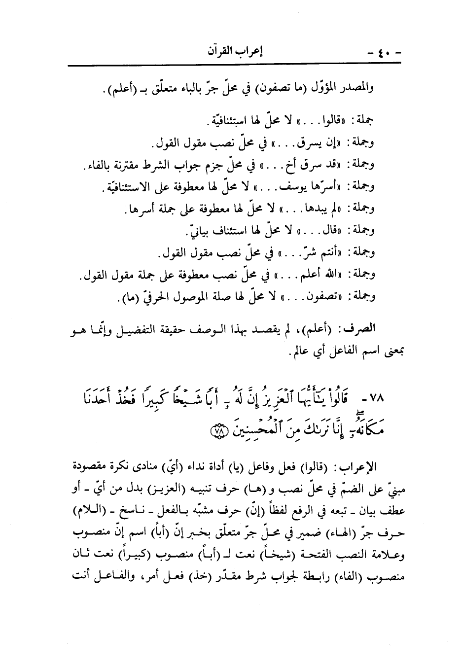 (الواو) عاطفة (إذا) ظرف للزمن المستقبل متضمّن معنى الشرط في محلّ نصب متعلّق بالجواب قالوا (قيل) فعل ماض مبنيّ للمجهول (اللام) حرف جرّ و (هم) ضمير في محلّ جرّ متعلّق ب (قيل) ، (تعالوا) فعل أمر مبنيّ على حذف النون قياسا.. والواو فاعل (إلى) حرف جرّ (ما) اسم موصول مبنيّ في محلّ جرّ متعلّق بفعل تعالوا (أنزل) فعل ماض (الله) لفظ الجلالة فاعل مرفوع (الواو) عاطفة (إلى الرسول) جارّ ومجرور متعلّق بفعل تعالوا (قالوا) مثل تعالوا (حسبنا) مبتدأ مرفوع. (ونا) ضمير مضاف إليه (ما) مثل الأول في محلّ رفع خبر (وجد) فعل ماض مبنيّ على السكون و (نا) ضمير فاعل (على) حرف جرّ و (الهاء) ضمير في محلّ جرّ متعلّق بمحذوف مفعول به ثان (آباء) مفعول به أوّل منصوب و (نا) مضاف إليه (الهمزة) للاستفهام (الواو) استئنافيّة (لو) حرف شرط غير جازم (كان) فعل ماض ناقص (آباء) اسم كان مرفوع و (هم) ضمير مضاف إليه (لا) نافية (يعلمون) مضارع مرفوع والواو فاعل (شيئا) مفعول به منصوب (الواو) عاطفة (لا يهتدون) مثل لا يعلمون.
