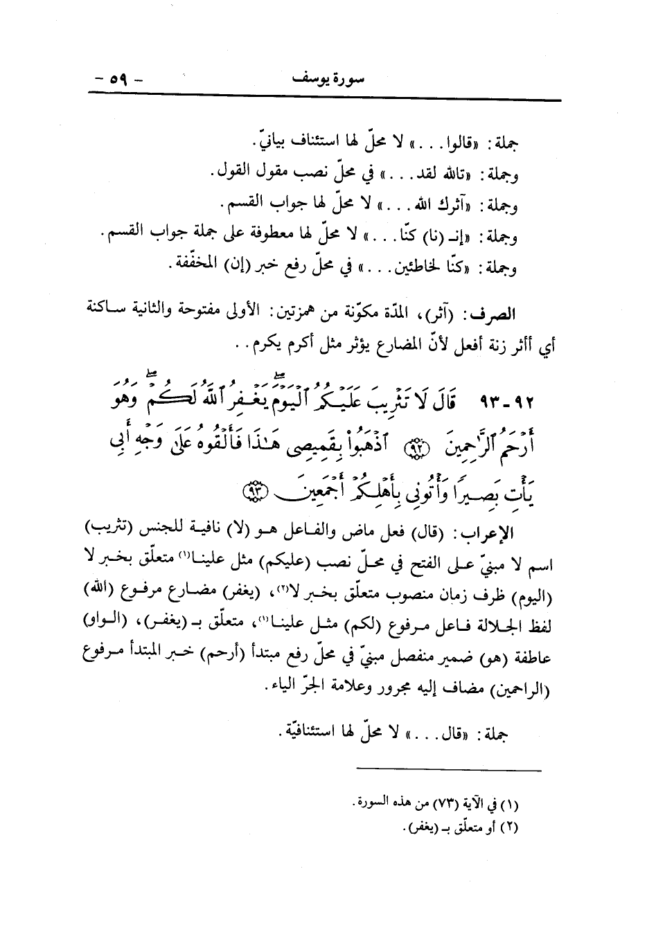 (إذ قال الحواريون) مثل إذ قال الله «2» ، (يا عيسى ابن مريم) مرّ إعرابها «3» ، (هل) حرف استفهام (يستطيع) مضارع مرفوع (ربّ) فاعل مرفوع و (الكاف) ضمير مضاف إليه (أن) حرف مصدري ونصب (ينزل) مضارع منصوب، والفاعل ضمير مستتر تقديره هو (على) حرف جرّ و (نا) ضمير في محلّ جر متعلق ب (ينزل) ، (مائدة) مفعول به منصوب (من السماء) جار ومجرور متعلق ب (ينزل) «4»