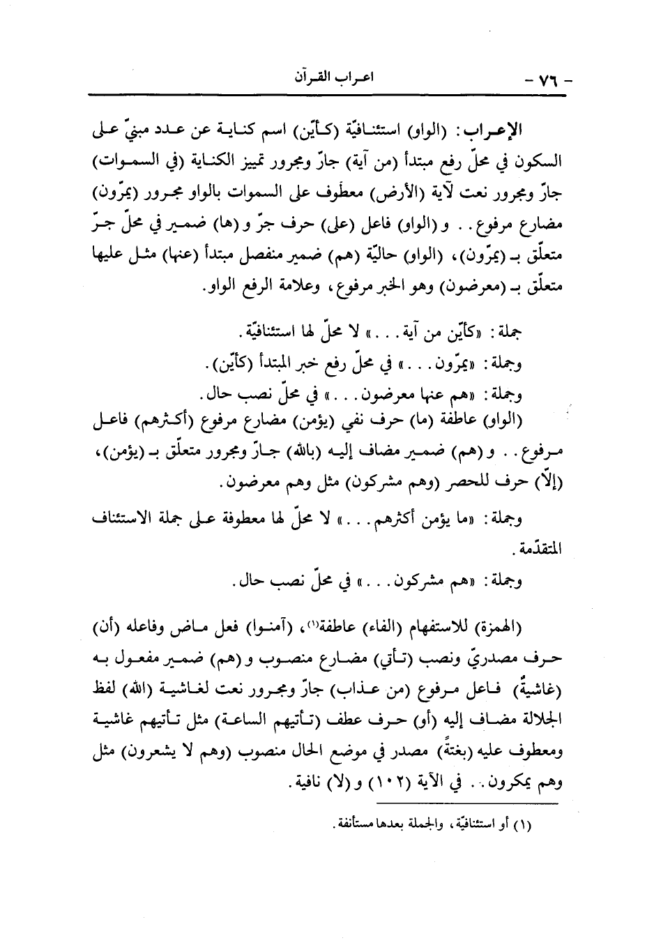 (الأرض) معطوف على السموات مجرور مثله (الواو) عاطفة (ما) اسم موصول مبنيّ في محلّ رفع معطوف على ملك (في) حرف جرّ و (هنّ) ضمير متّصل مبنيّ في محلّ جرّ متعلّق بمحذوف صلة ما (الواو) عاطفة (هو) ضمير منفصل مبنيّ في محلّ رفع مبتدأ (على كلّ) جارّ ومجرور متعلّق ب (قدير) ، (شيء) مضاف إليه مجرور (قدير) خبر المبتدأ هو مرفوع.
