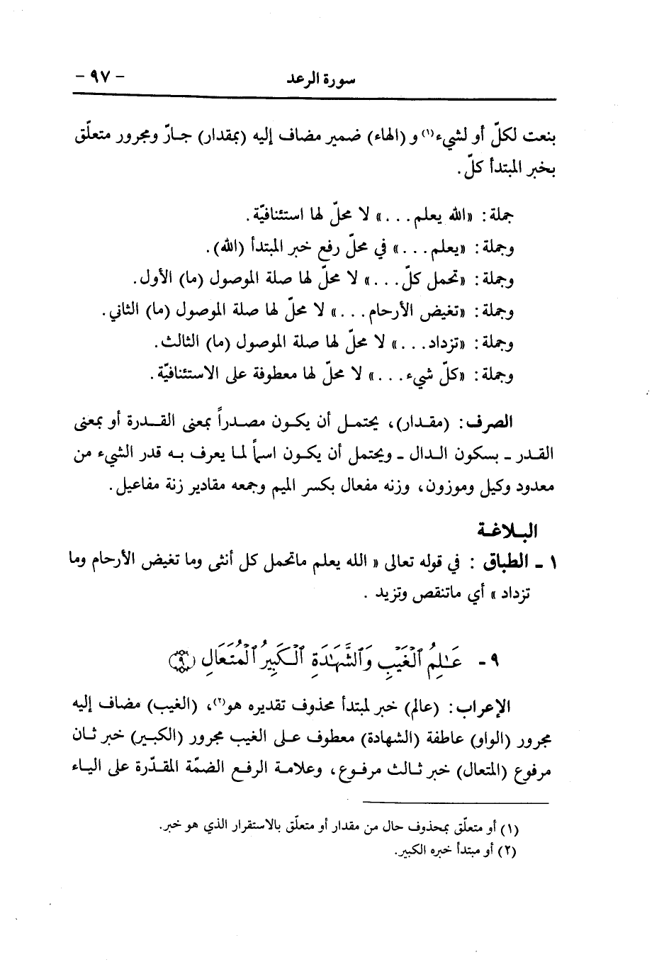(قل) فعل أمر، والفاعل ضمير مستتر تقديره أنت (الهمزة) للاستفهام الإنكاري (غير) مفعول به أول مقدم منصوب (الله) لفظ الجلالة مضاف إليه مجرور (أتخذ) مضارع مرفوع، والفاعل ضمير مستتر تقديره أنا، (وليا) مفعول به ثان منصوب (فاطر) بدل من لفظ الجلالة مجرور مثله، أو نعت له (السموات) مضاف إليه مجرور (الواو) عاطفة (الأرض) معطوف على السموات مجرور (الواو) حالية (هو) مثل السابق «1» ، (يطعم) مضارع مرفوع، والفاعل هو (الواو) عاطفة (لا) نافية (يطعم) مضارع مبني للمجهول مرفوع، ونائب الفاعل ضمير مستتر تقديره هو (قل) مثل الأول (إنّ) حرف مشبه بالفعل و (الياء) ضمير في محلّ نصب اسم إنّ (أمرت) فعل ماض مبني للمجهول ... والتاء ضمير في محلّ رفع نائب فاعل (أن) حرف مصدري ونصب (أكون) مضارع منصوب ناقص، واسمه ضمير مستتر تقديره أنا (أول) خبر أكون منصوب (من) اسم موصول مبني في محلّ جر مضاف إليه «2» ، (أسلم) فعل ماض، والفاعل ضمير مستتر تقديره هو وهو العائد.
